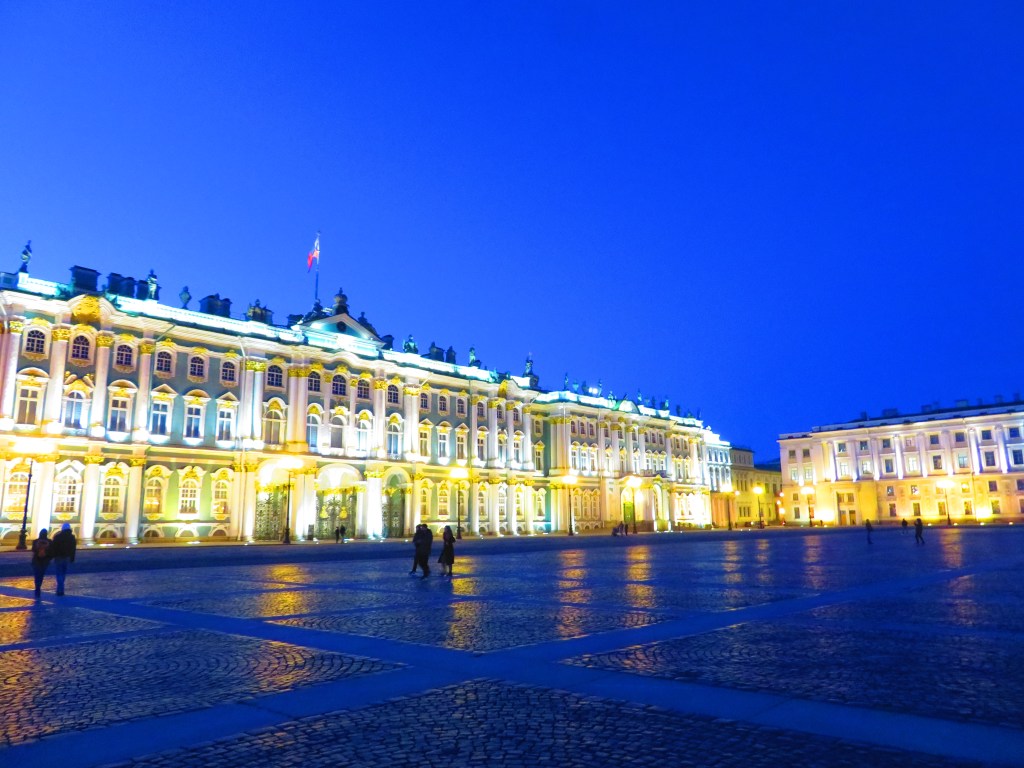 サンクトペテロブルク=夜景と直結はなかなかしませんが、夜のエルミタージュ美術館がおすすめ。日中は、白と黄緑?色で統一された建物が、訪れる人を楽しませてくれますが、夜は建物に写し出される、光のおもてなしの姿に早変わり。周辺では、ストリートミュージシャンが演奏していることもあり、ロマンチックな時を過ごすことができます。